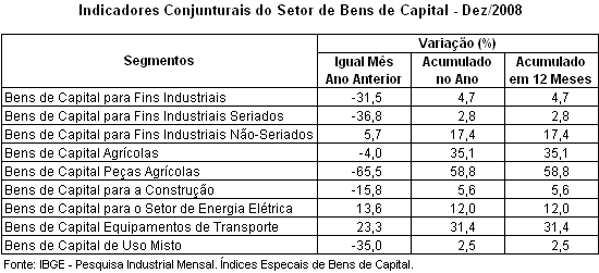 Na série mensal (dezembro de 2008 – dezembro de 2007), todas quatro categorias de uso registraram variação negativa. O segmento de bens de consumo duráveis, o mais afetado pela combinação deletéria do aprofundamento da recessão nas economias avançadas e consequentes impactos no comércio mundial e da forte contração do crédito doméstico, registrou queda recorde de –42,2%, impactado pelos itens automóveis (–58,9%), celulares (–61,4%) e eletrodomésticos (–17,5%), que também registraram reduções recordes.