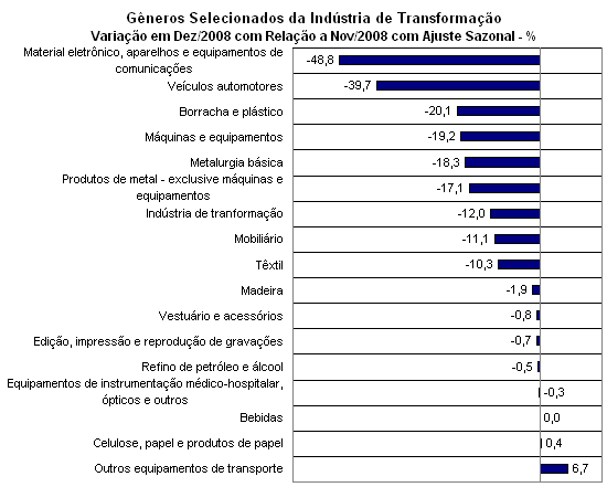 Por Dentro da Indústria de Transformação: Gêneros e Subsetores. Em dezembro, descontados os efeitos da sazonalidade, a indústria geral e a indústria de transformação registraram queda recorde de, respectivamente 12,4% e 12,0%, frente ao mês de novembro. Esses resultados refletiram a retração generalizada no nível de atividade verificada em 25 das 27 atividades pesquisadas. As duas únicas pressões positivas vieram de celulose e papel (0,4%) e outros equipamentos de transporte (6,7%). Segundo o IBGE, o principal impacto negativo originou-se no setor de veículos automotores (–39,7%) seguido por máquinas e equipamentos (–19,2%), material eletrônico e equipamentos de comunicações (–48,8%), metalurgia básica (–18,3%), borracha e plástico (–20,1%), indústria extrativa mineral (–11,8%) e outros produtos químicos (–9,0%). Esse quadro de queda generalizada foi especialmente marcado pelo movimento de setores mais sensíveis à restrição de crédito e a queda das exportações de commodities.