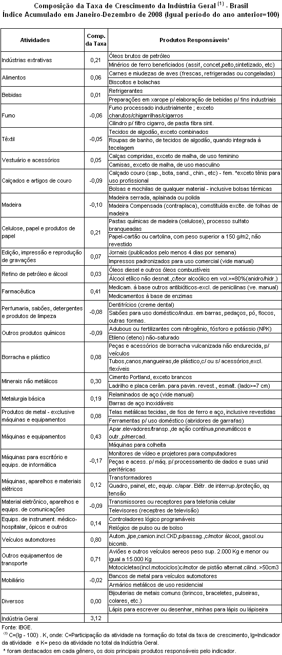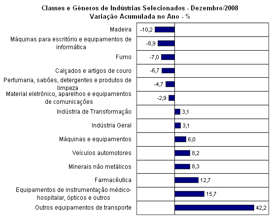 No indicador acumulado para o ano de 2008, as indústrias geral e de transformação registraram, ambas, aumento de 3,1%, bem inferior ao verificado em 2007, em razão da forte retração da atividade fabril nos últimos três meses do ano. Para esse resultado contribuiu o aumento da produção em dezessete atividades das vinte e sete atividades pesquisadas, das quais onze cresceram acima da média global. As principais contribuições originaram-se nas indústrias de veículos automotores veículos automotores (8,2%), máquinas e equipamentos (6,0%), outros equipamentos de transporte (42,2%), farmacêutica (12,7%) e minerais não-metálicos (8,3%). Em contraste, as principais pressões negativas foram provenientes das indústrias de madeira (–10,2%), máquinas para escritório e equipamentos de informática (–8,9%), fumo (–7,0%), calçados e artigos de couro (–6,7%) e perfumaria, sabões, detergentes e produtos de limpeza (–4,7%).
