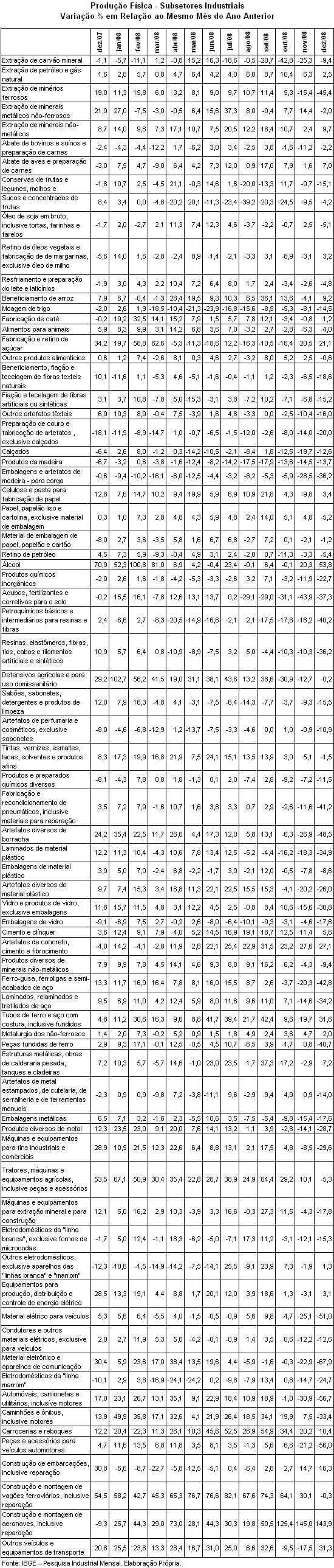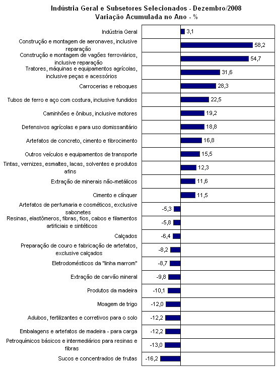 Nessa mesma base de comparação, 44 dos 76 subsetores da série mais desagregada do IBGE ampliaram o nível de produção em 2008 em relação ao ano anterior. As maiores taxas de variação foram registradas nos subsetores de construção e montagem de aeronaves (58,2%), construções e montagens de vagões ferroviários (54,7%), tratores e máquinas agrícolas (31,6%), carrocerias e reboques (28,3%), tubos de ferro e aço (22,5%), defensivos agrícolas (18,8%), caminhões e ônibus (19,2%), artefatos de concreto (16,8%), outros equipamentos de transporte (15,5%), cimentos e clínquer (11,5%), automóveis (7,0%). No sentido oposto, dentre os trinta e um subgêneros em queda, os recuos mais expressivos foram registrados em sucos e concentrados de fruta (–16,2%), petroquímicos básicos (–13,0%), adubos e fertilizantes (–12,2%) moagem de trigo (–12,0%), embalagem e artefatos de madeira (–12,2%), produtos de madeira (–10,1%) e eletrodomésticos da “linha marrom” (–8,7%).