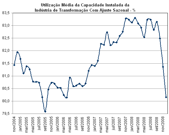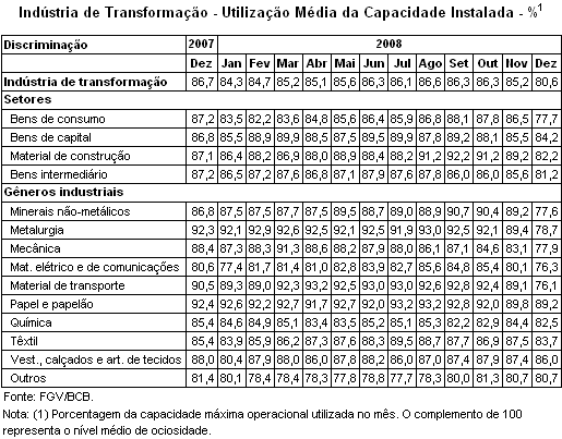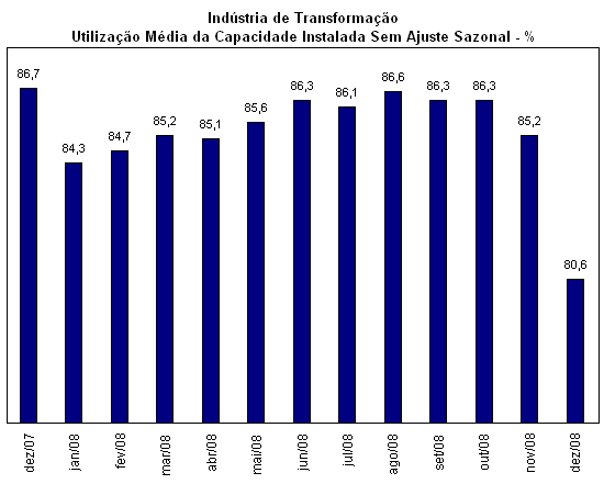 Utilização de Capacidade na Indústria de Transformação. A forte desaceleração do ritmo da produção fabril em dezembro se refletiu na utilização média de capacidade instalada da indústria de transformação. O indicador, com ajuste sazonal, calculado pela CNI, mostra que a indústria de transformação registrou o menor nível de utilização de capacidade instalada desde abril de 2006: 80,2% (contra 81,4% registrados em novembro). Esse índice também é bem menor do que o registrado em dezembro de 2007(83,2%).