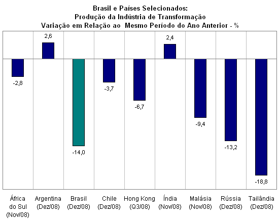 Na comparação do resultado da indústria de transformação brasileira com os de economias periféricas com semelhante grau de desenvolvimento, observa-se que, em dezembro de 2008, a produção manufatureira do Brasil registrou queda recorde de 14,0% em relação a igual mês do ano anterior. Os impactos da crise financeira e da forte recessão nas economias avançadas também se fizeram sentir na Tailândia e na Rússia, cujas indústrias registraram expressiva retração, de respectivamente, 18,8% e 13,2%. Em um cenário de deterioração das condições econômicas e financeiras mundiais, destaca-se o dinamismo das indústrias de transformação da Argentina e da Índia. A indústria argentina elevou o nível de produção em 2,6% na comparação com dezembro de 2007, enquanto a indústria indiana registrou variação de 2,4% em novembro de 2008 com relação a novembro do ano anterior na mesma base de comparação.