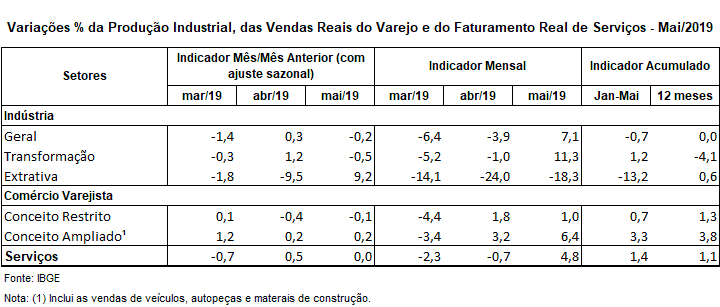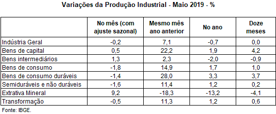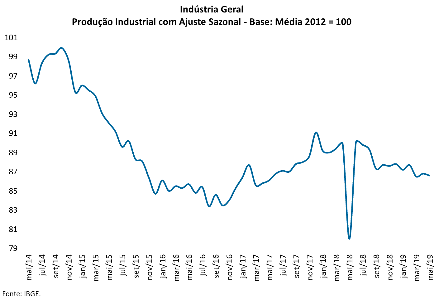 Em maio de 2019, a produção da indústria encolheu -0,2% em relação ao mês anterior, já descontados os efeitos sazonais, devido a contribuições negativas em 70% de seus ramos e 53% das 15 localidades acompanhadas pelo IBGE.