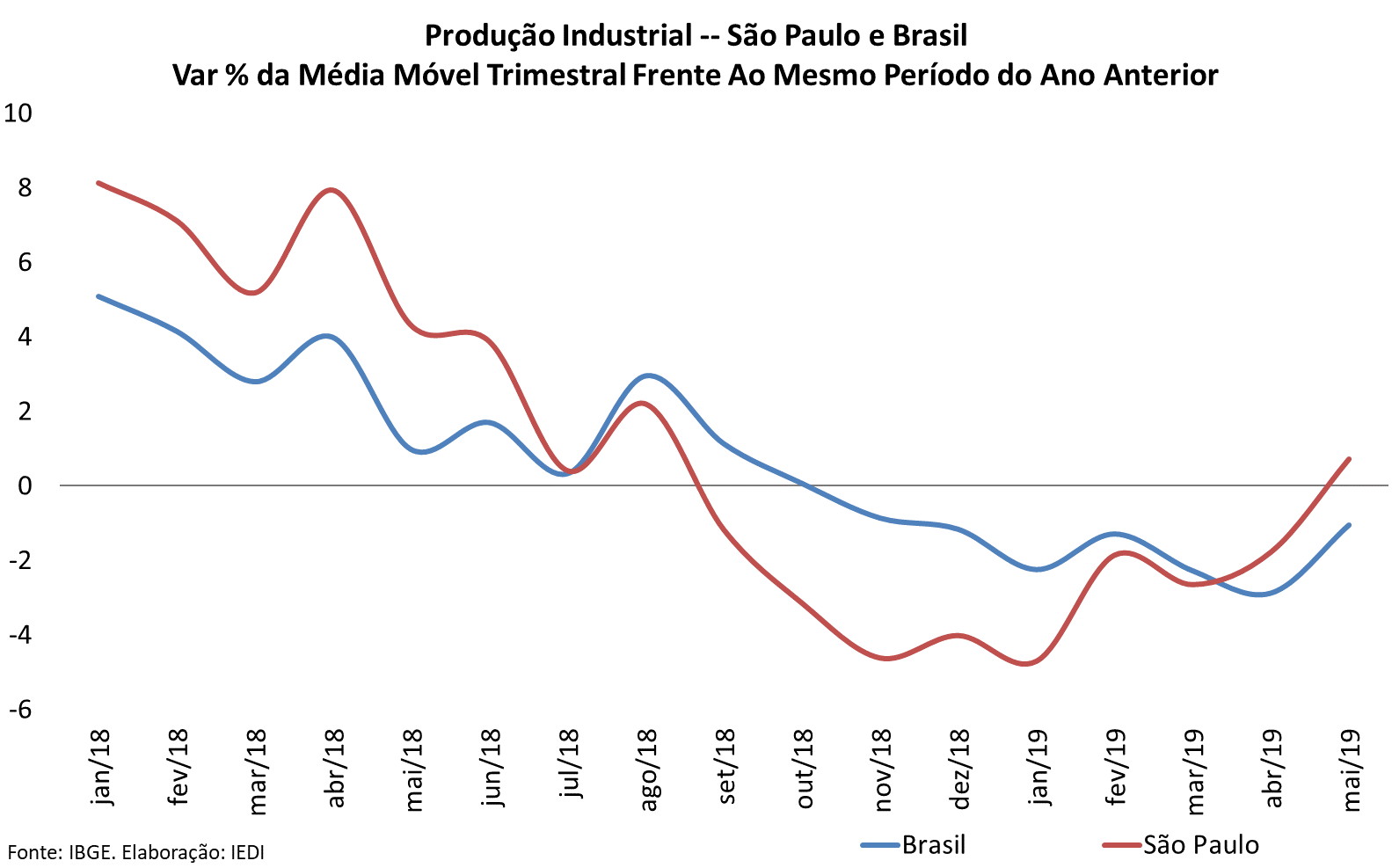 De fato, São Paulo vem apresentando uma fase de baixo dinamismo depois de uma sequência de resultados negativos desde meados de 2018. Esta evolução, que foi decisiva para jogar o total Brasil em uma nova fase recessiva desde o final do ano passado, mas agora vem ajudando a amenizar suas perdas. Por enquanto, contudo, sua contribuição é mínima e não está sendo suficiente para restabelecer plenamente o crescimento da indústria nacional.