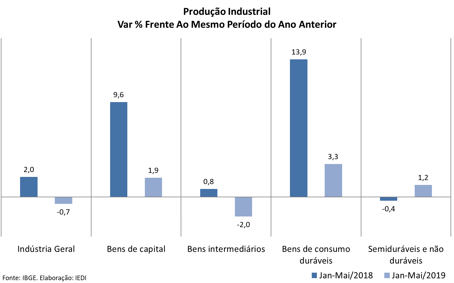 O desempenho acumulado nos cinco meses de 2019 frente ao mesmo período do ano anterior permanece negativo, em -0,7%, e só não foi pior devido à base de comparação interanual muito baixa para o mês de mai/19, que permitiu uma variação de +7,1%. Cabe lembrar que as últimas semanas de maio de 2018 foram marcadas pela greve dos caminhoneiros, que bloqueou o fluxo de mercadorias e perturbou a linha de produção de muitas empresas.