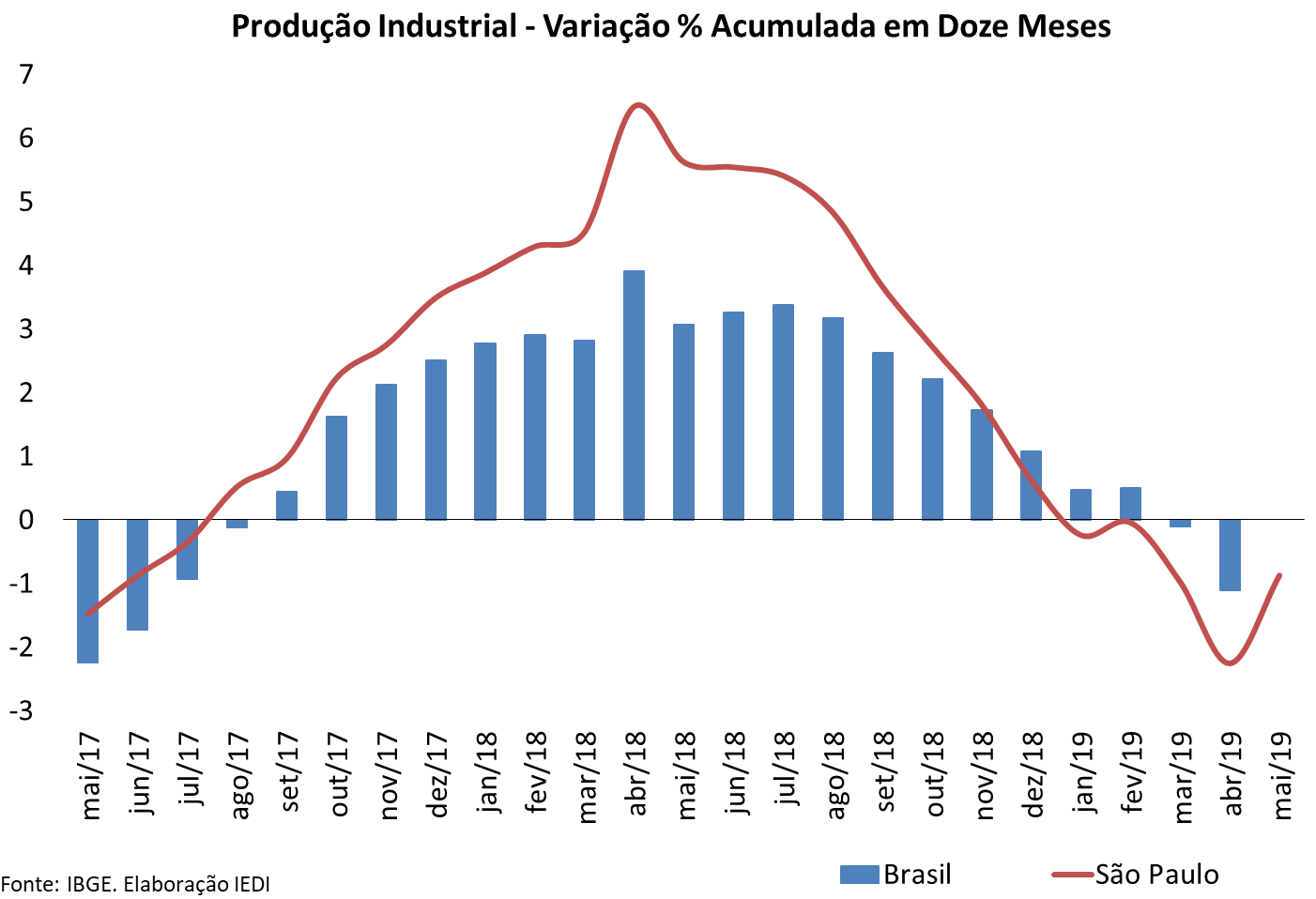 No acumulado de janeiro a maio de 2019, frente ao mesmo período do ano anterior, enquanto São Paulo registra +0,5%, o total Brasil ainda está com -0,7% de retração. A atual contribuição paulista se mostra bastante restringida, se comparada ao que ocorria nos primeiros cinco meses de 2018.