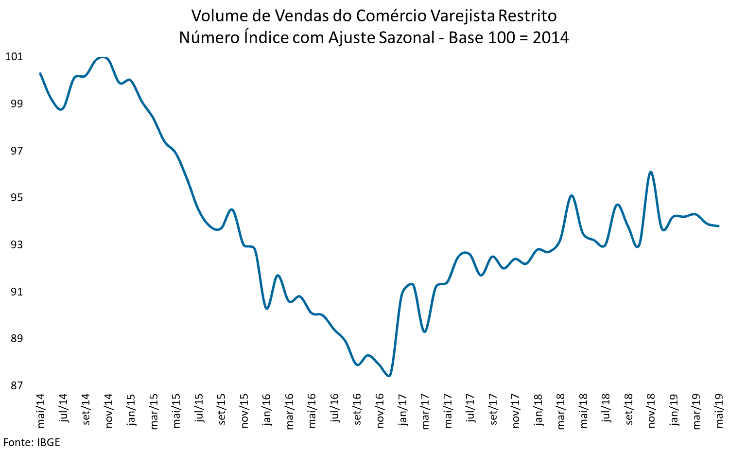 Em maio último, as vendas reais do varejo restrito ficaram no negativo, registrando -0,1% frente ao mês anterior já descontados os efeitos sazonais. Variações muito próximas da estagnação (isto é, de 0%) é o que tem marcado a sequência de resultados deste o início do ano. Deste modo, o nível de vendas de maio é virtualmente o mesmo daquele de dezembro de 2018 (+0,1%). Em outras palavras, a recuperação do varejo, assim como a da indústria, vai ficando cada vez mais rarefeita.