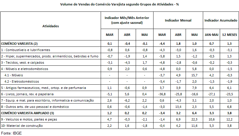Tomado em seu conceito ampliado, isto é, considerando as vendas de automóveis, autopeças e material de construção, o varejo apresenta um quadro menos intenso de prostração, mas que tampouco ajuda muito a superar as grandes perdas sofridas nos últimos anos de crise. Na passagem de abril para maio, já descontada a sazonalidade, o resultado foi de apenas +0,2%, pela segunda vez consecutiva.
