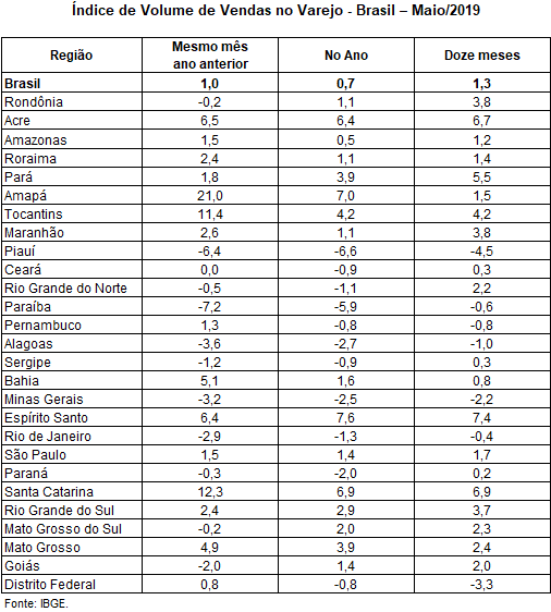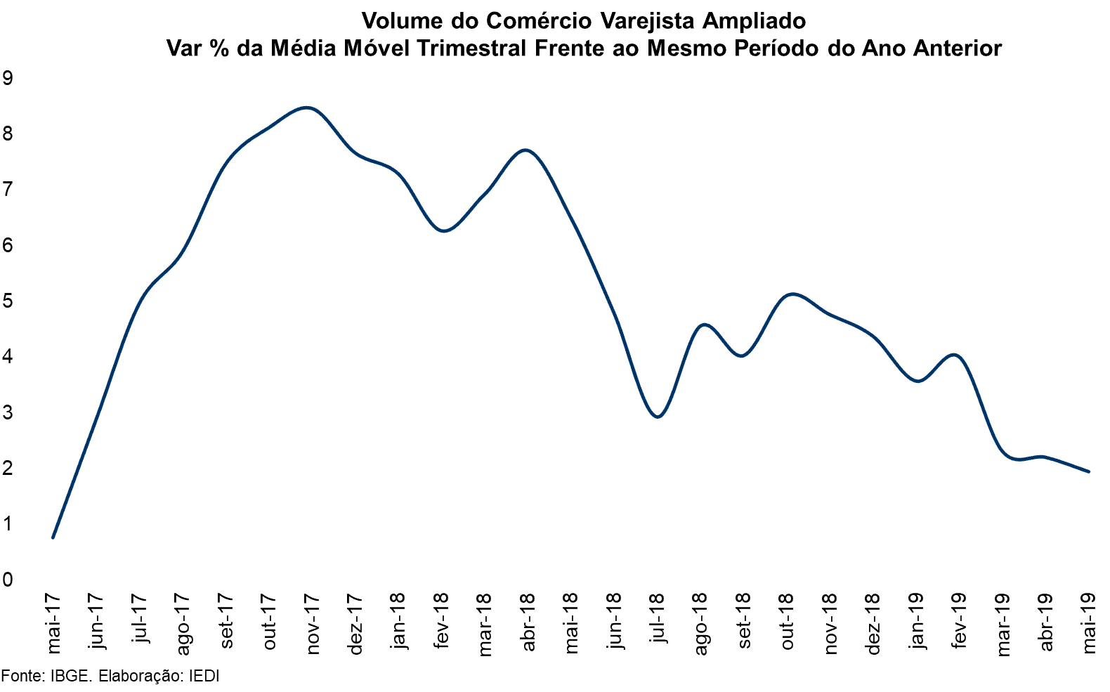 Em janeiro-maio de 2019, frente a igual período do ano anterior, as vendas reais do varejo cresceram apenas +0,7%, o que representa cerca de 1/5 do crescimento de jan-mai/18 (+3,2%). Em seu conceito ampliado, o diferencial é de quase metade, graças a bases muito baixas de comparação: +3,3% em jan-mai/19 e +6,4% em jan-mai/18.