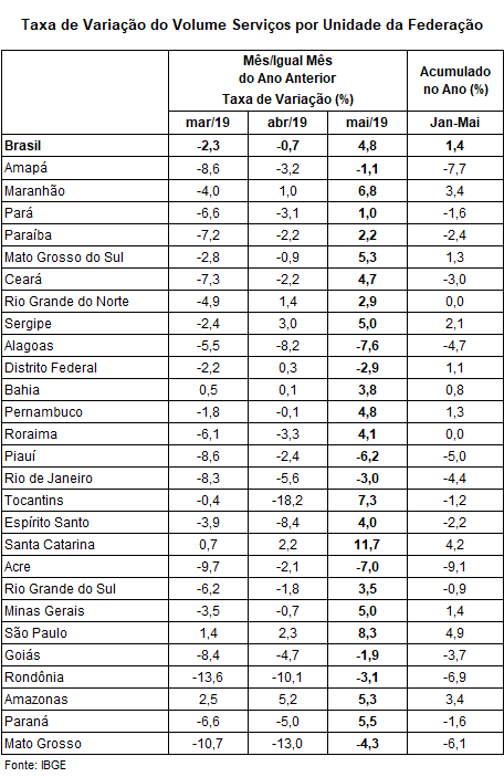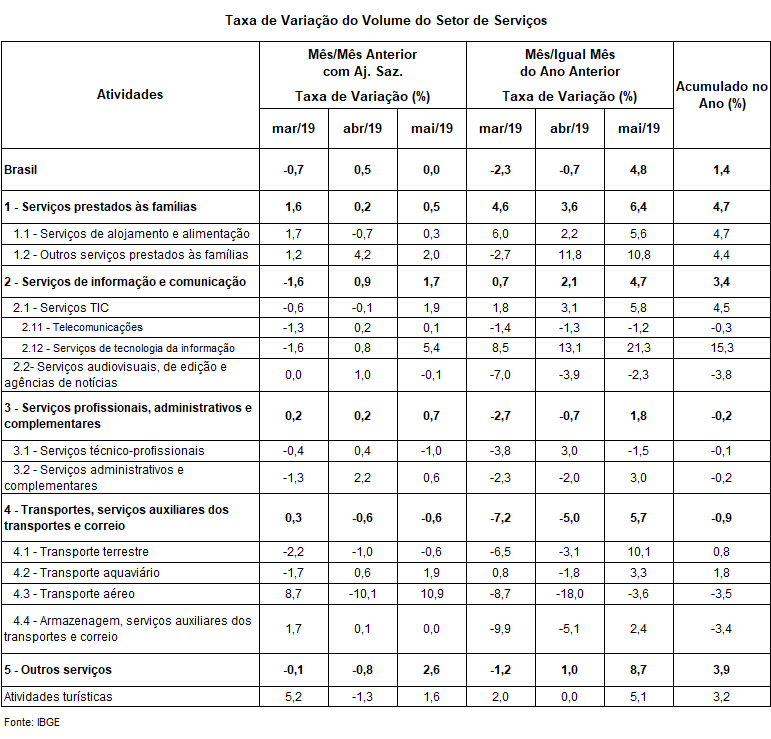 Já em relação aos serviços profissionais, administrativos e complementares, depois de perdas sucessivas de faturamento desde início de 2015, os resultados permanecem negativos no acumulado de 2019 até o mês de maio, mas ao menos vêm se aproximando da estabilidade. A queda de -1,8% em jan-mai/18 se reduziu para apenas -0,2% em jan-mai/19.