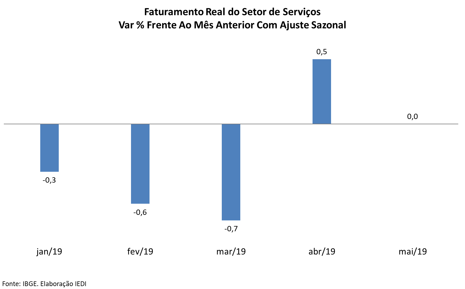 O quadro de paralisia foi generalizado em maio de 2019. Assim como a indústria (-0,2%) e o varejo ampliado (+0,2%), o desempenho do setor de serviços não saiu do lugar em relação a abril, já descontados os efeitos sazonais. Seu faturamento real registrou 0%, fazendo com que seu nível permanecesse -1,1% inferior ao do último mês de 2018.