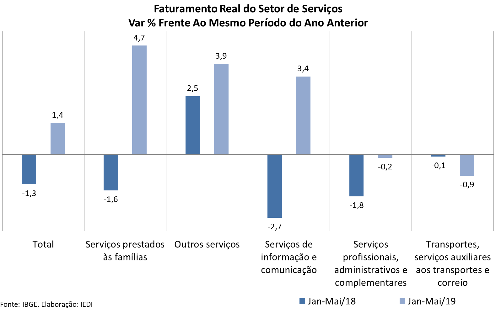 A sequência de resultados positivos mais consistente cabe aos serviços prestados às famílias (+4,7% em jan-mai/19), tanto em função dos serviços de alojamento e alimentação como de outros serviços. Como compreendem muitas atividades informais, o desempenho desta fração do setor de serviços está associado à criação de postos de trabalho sem carteira assinada ou por conta própria, que tem marcado a melhora do quadro do emprego desde o início da recuperação da economia.