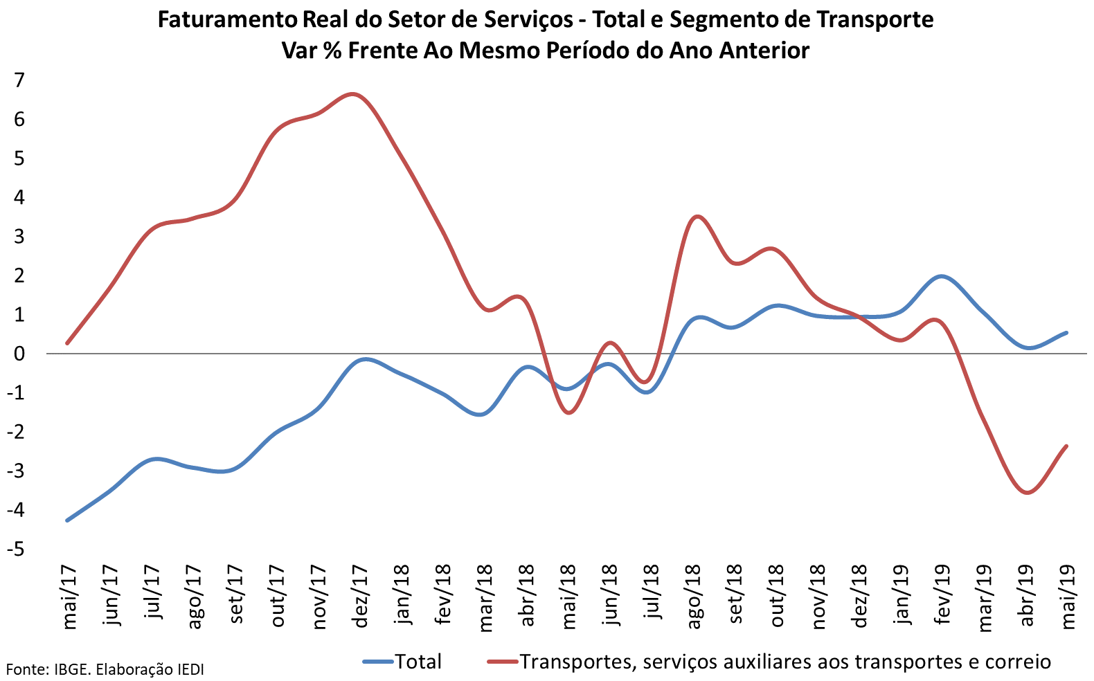 No caso dos transportes, o declínio é mais intenso em seu componente de transporte aéreo (-3,5% em jan-mai/19), mas que passou a ser acompanhado mais recentemente pelo recuo do faturamento real também do ramo de transportes terrestres (-2,4% no trimestre mar-mai/19), decorrente da perda de força da recuperação econômica dos últimos meses. Com isso o desempenho de jan-mai/19 é pior do que de igual período de 2018.