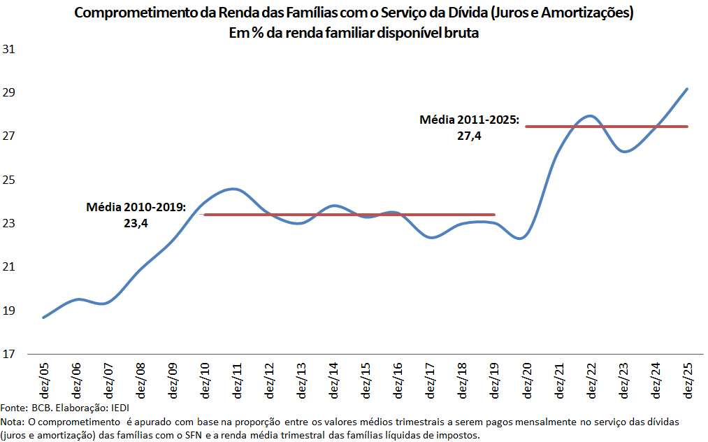 O comprometimento da renda com pagamentos de juros atingiu 10,4% e com o serviço total da dívida (juros mais amortização) representou 29,2% da renda familiar no final de 2025.