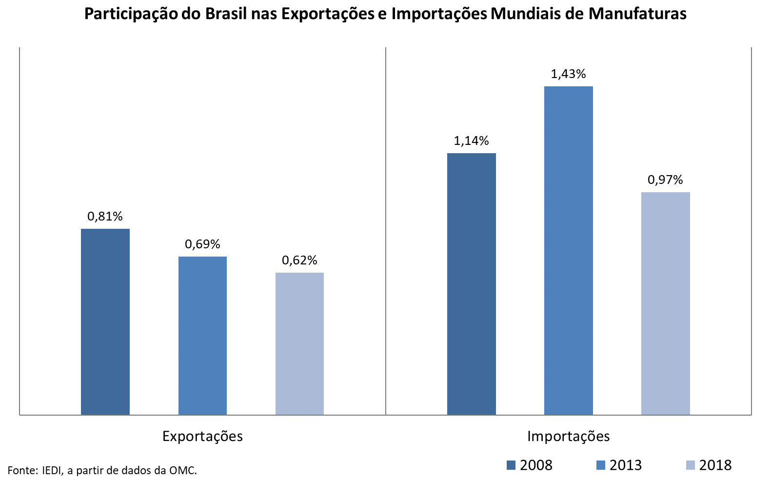 Do lado das importações, embora nossa participação no total mundial seja maior, também houve retrocesso de 1,14% em 2008 para 0,97% em 2018.