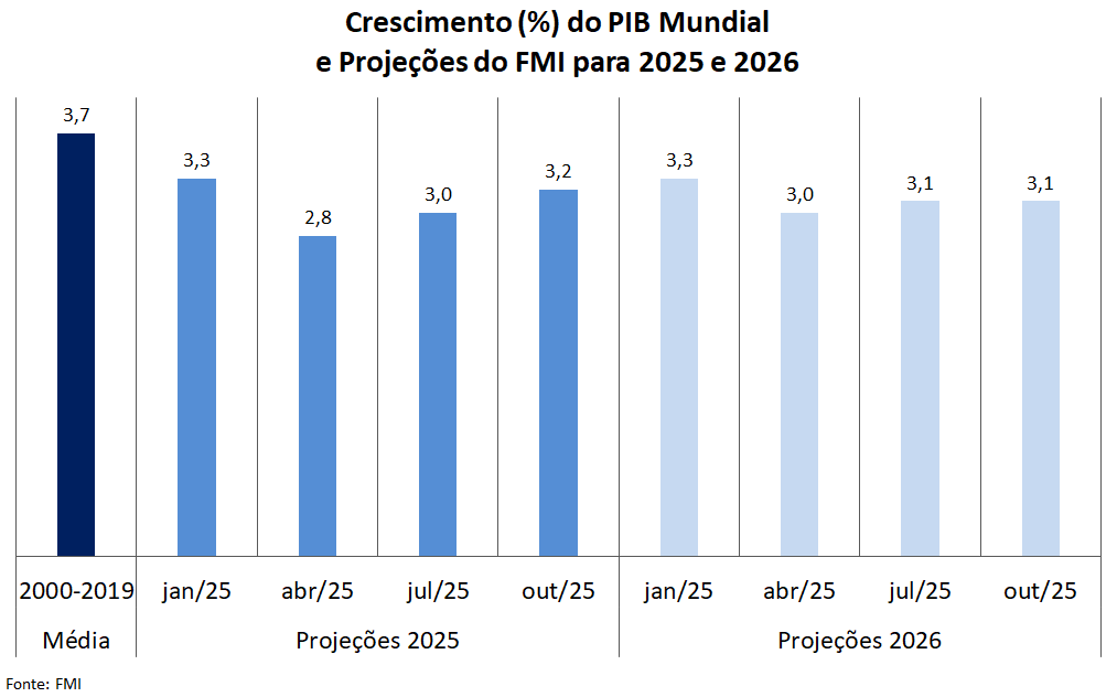 O FMI vem revisando para cima suas projeções do PIB global, chegando a +3,2% para 2025 e +3,1% para 2026 na sua última atualização, aquém, portanto, da média 2000-2019 de +3,7%.