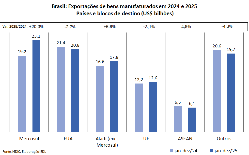 O déficit do Brasil em bens manufaturados (US$ 149 bilhões) aumentou +12% em 2025, decorrente de um avanço mais intenso das importações (+8,8%) vis-à-vis as exportações (+3,9%).