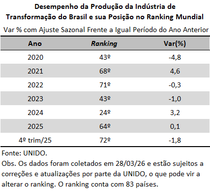 Para o Brasil, a virtual estabilidade industrial em 2025 (+0,1%) nos levou à 64ª colocação entre os 83 países do ranking, isto é, 40 posições abaixo de onde ficamos em 2024.