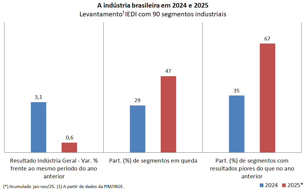 Levantamento do IEDI com 90 segmentos industriais mostra que 2/3 se saíram pior em 2025 do que em 2024 e que 47% chegaram a perder produção.