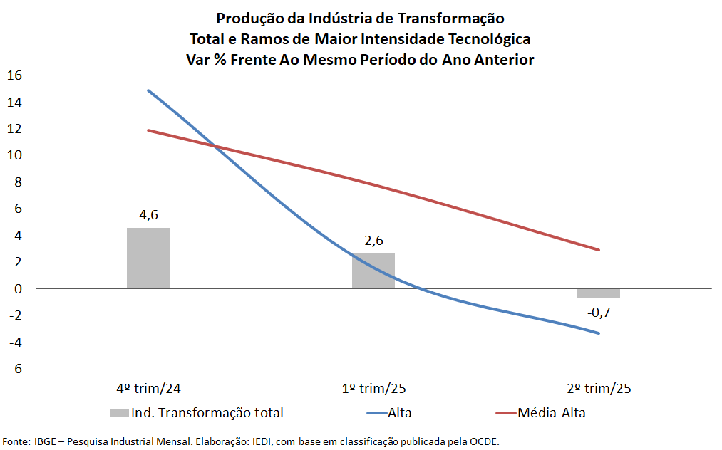 A indústria de alta tecnologia, cuja produção se expandia a taxas de dois dígitos no final de 2024, caiu -3,3% no 2º trim/25. Foi quem pior se saiu no trimestre.