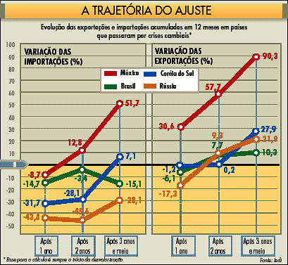 Logo depois da crise cambial que se abateu sobre esses países em 1997, foram realizados ajustes da balança comercial parecidos com o brasileiro. As desvalorizações do won na Coréia, e também a do rublo, na Rússia em 1998, e do peso no México, em 1995, foram seguidas de superávits na balança à custa de redução nas importações, tal qual no Brasil. Mas a grande reviravolta ocorreu no segundo e terceiro anos após a crise. Passada a turbulência, todos esses países conseguiram aumentar substancialmente suas exportações.