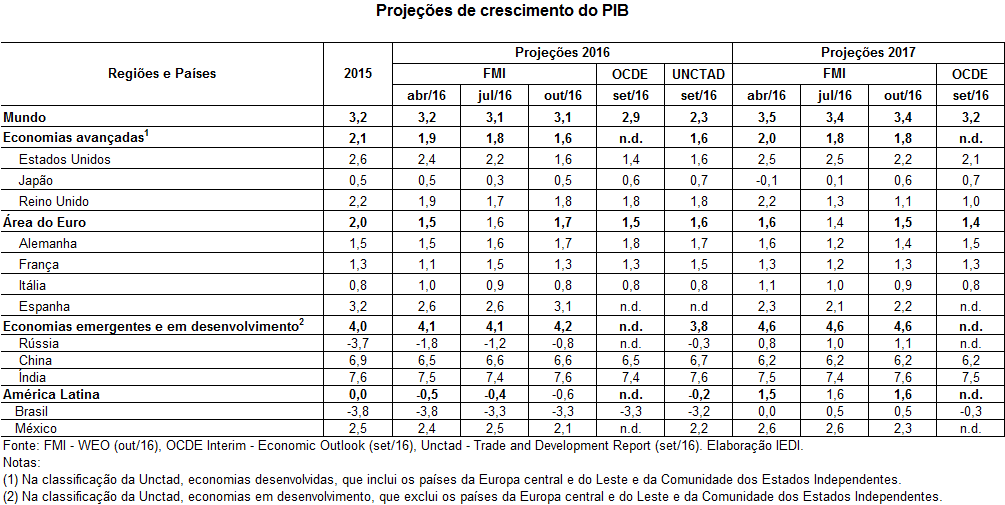 Para 2017, o FMI projeta aceleração da trajetória ascendente (para 4,6%) das economias emergentes e em desenvolvimento, ancorada na saída da recessão da Rússia (1,1%) e do Brasil (0,5%), retomada no México (2,3%), manutenção do crescimento indiano no mesmo patamar de 2016 (7,6%), mas uma nova desaceleração da China (6,2%).