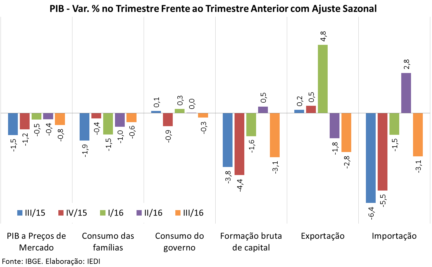 • PIB: -1,1% no 4º trim. 2015, -0,5% no 1º trim. 2016, -0,4% no 2º trim. 2016 e, agora, -0,8% no 3º trim. 2016, sempre com ajuste sazonal frente ao período anterior