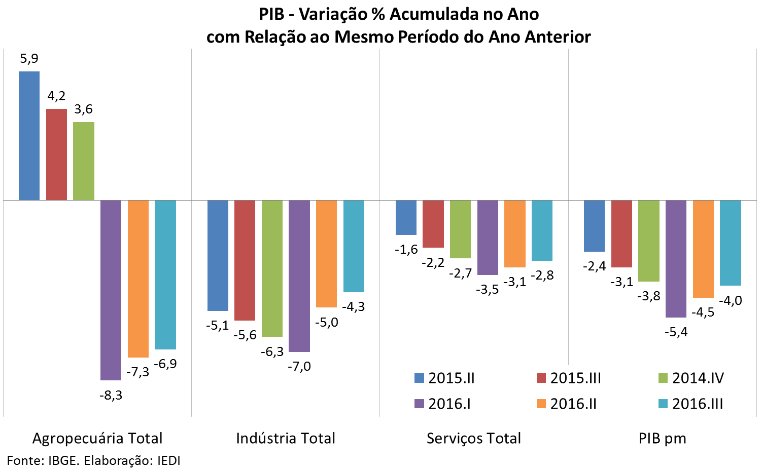 No ano, o PIB brasileiro acumulou recuo de 4,0% em relação a igual período de 2015, a maior queda acumulada no período de janeiro a setembro desde o início da série histórica iniciada em 1996. Nesta base de comparação, todas as atividades registraram queda: Agropecuária (-6,9%), Indústria (-4,3%) e Serviços (-2,8%).