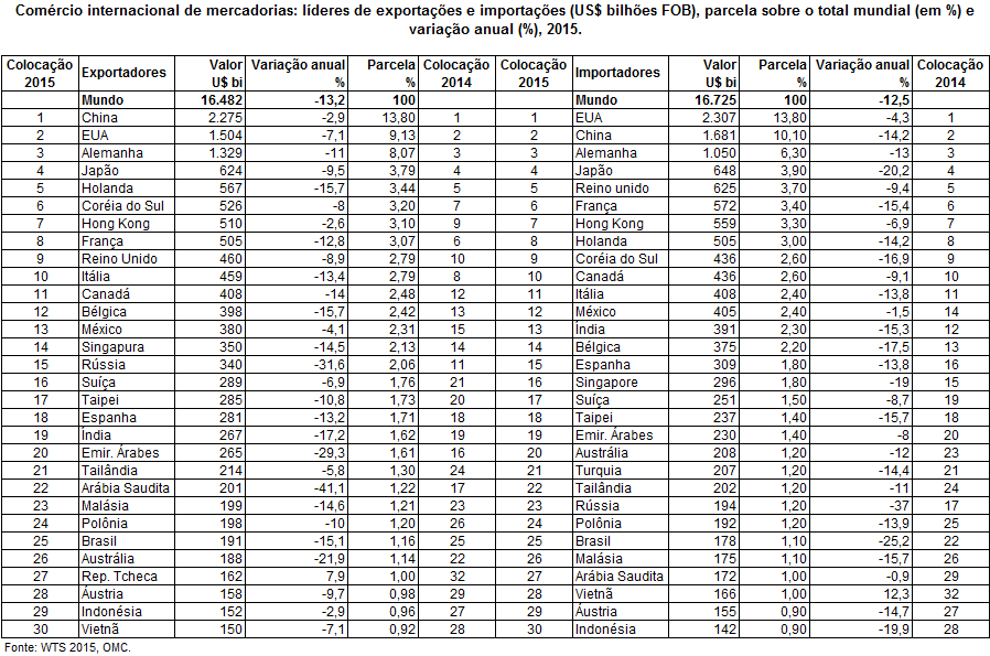 Do lado das importações de bens, o Brasil perdeu três posições, da 22ª em 2014 para 25ª, o que está associado à forte recessão da economia doméstica em 2015. A Rússia também caiu, da 17ª para a 23ª posição. O país líder continuou sendo os Estados Unidos, cuja parcela nas importações mundiais subiu de 12,7% em 2014 para 13,8% em 2015 – mesmo com queda de 4% em relação ao ano anterior. A China veio em segundo lugar, mas assinalou variação de -14,2% nas importações.