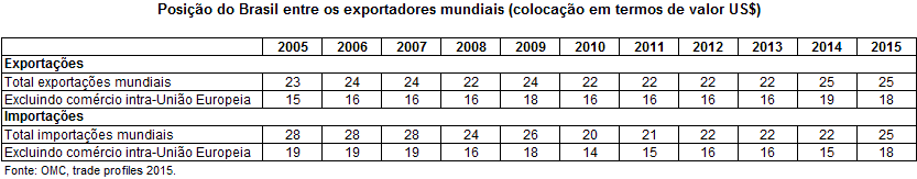 A participação do Brasil no valor das exportações mundiais de bens decresceu de 1,3% em 2013 para 1,2% em 2014, ficando estável em 2015, considerando o comércio intra União Europeia. Em termos de importações, a parcela brasileira ficou estável em 1,3% em 2013 e 2014, recuando para 1,1% em 2015. Como convém observar, a posição brasileira como 25º maior exportador e importador de bens é desproporcional ao tamanho da sua economia, uma das dez maiores do mundo.