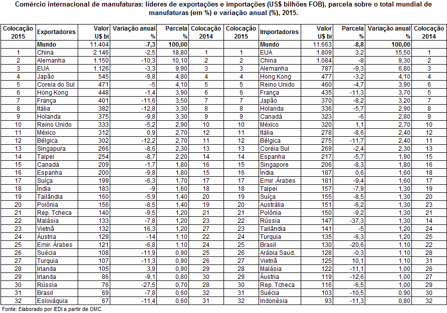 Já no caso das importações de manufaturas a participação brasileira foi de 1,12%. No ranking das importações de manufaturas, em razão de sua recessão, o Brasil em 2015 perdeu três posições, passando a ser o 25º maior importador mundial, após queda no valor de 20,6%.