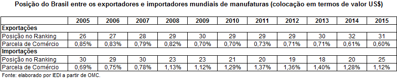 Porém, a situação relativa do Brasil no comércio global é ainda mais dramática se for considerado o comércio de manufaturas. Em 2015, o Brasil voltou a subir no ranking dos maiores exportadores desses bens, passando da 32ª posição em 2014 para 31ª (tendo sido a 26º maior em 2005), mas com retração de 7,8% em valor (enquanto as exportações mundiais de manufaturas caíram 7,3% em 2015).