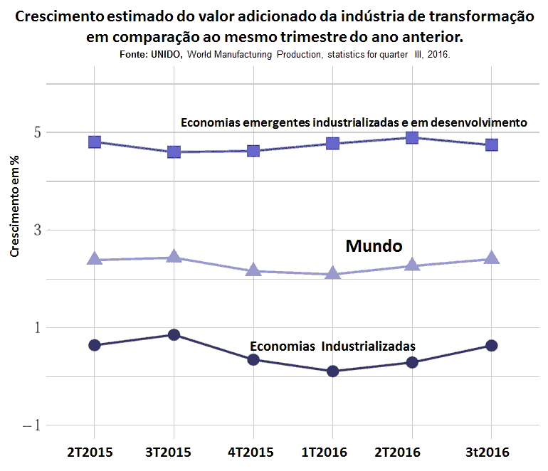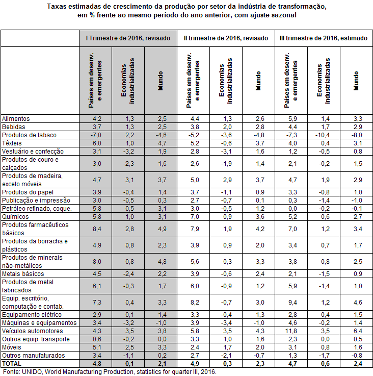 A indústria de transformação mundial no terceiro trimestre de 2016. Segundo o relatório da UNIDO (United Nations Industrial Development Organization) referente ao terceiro trimestre de 2016, a evolução da indústria de transformação mundial se manteve fraca e não há evidências de que vai melhorar no curto prazo. A taxa de crescimento da produção de manufaturados foi de 2,4% em julho-setembro de 2016 em comparação à igual período do ano anterior. Porém, existem riscos permeando os arranjos políticos das relações transatlânticas que podem perturbar a trajetória do setor no curto e médio prazos.
