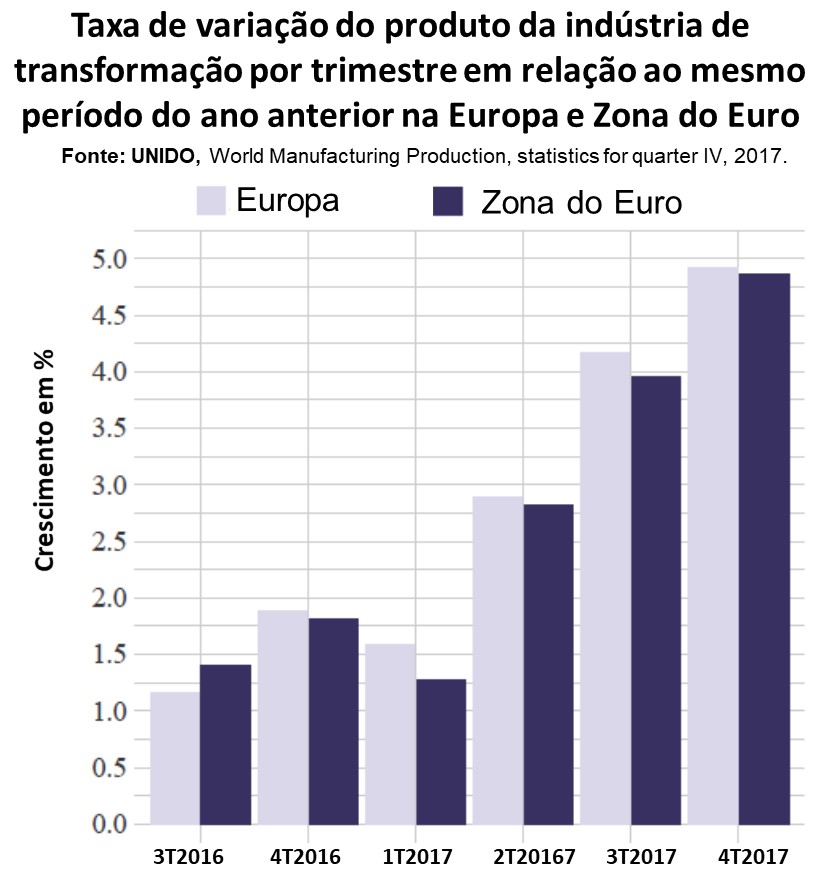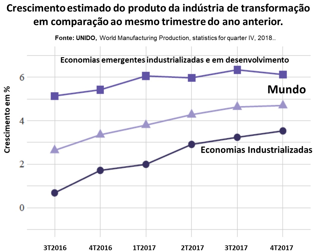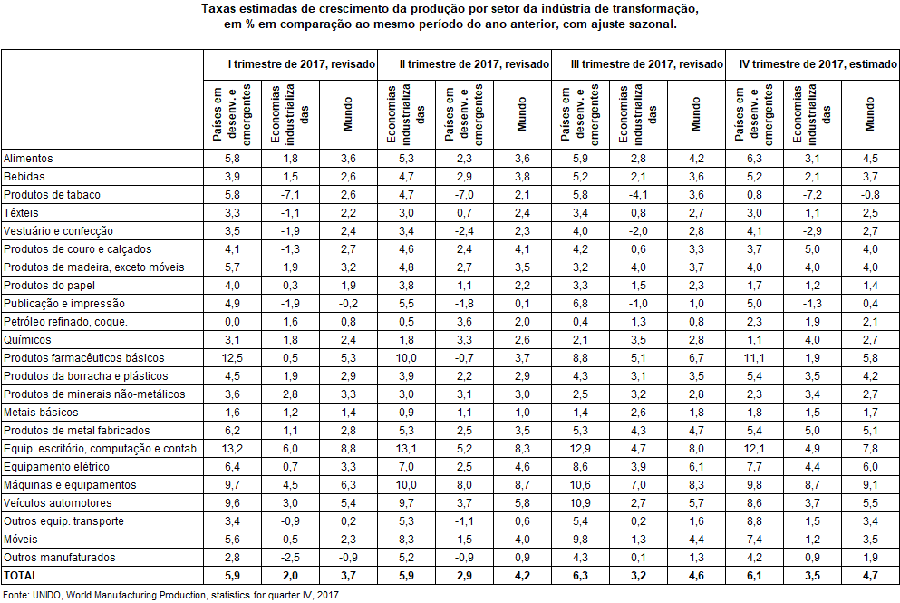 A indústria de transformação mundial no quarto trimestre de 2017. O relatório da UNIDO (United Nations Industrial Development Organization) sobre a indústria de transformação mundial no quarto trimestre de 2017 mostra que o crescimento da indústria mundial foi acelerando ao longo do ano, assinalando 3,7%, 4,2%, 4,6% e 4,7% do primeiro ao último trimestre em comparação com igual período de 2016. Em relação ao trimestre imediatamente anterior, o crescimento da indústria de transformação mundial foi 1,8% em janeiro-março, 1,5% em abril-junho, 1,5% em julho-setembro e 1,4% em outubro-dezembro de 2017.