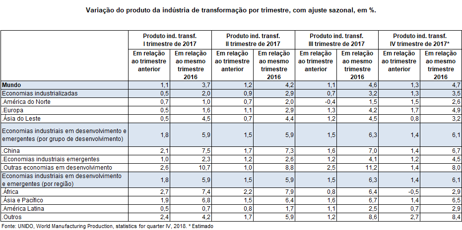 Os dados da UNIDO (United Nations Industrial Development Organization) apontam para uma aceleração do crescimento da indústria de transformação mundial ao longo de 2017, assinalando 3,7%, 4,2%, 4,6% e 4,7% do primeiro ao último trimestre em comparação com igual período de 2016. Em relação ao trimestre imediatamente anterior, o crescimento foi 1,8% em janeiro-março, 1,5% em abril-junho, 1,5% em julho-setembro e 1,4% em outubro-dezembro de 2017, já descontados os efeitos sazonais.