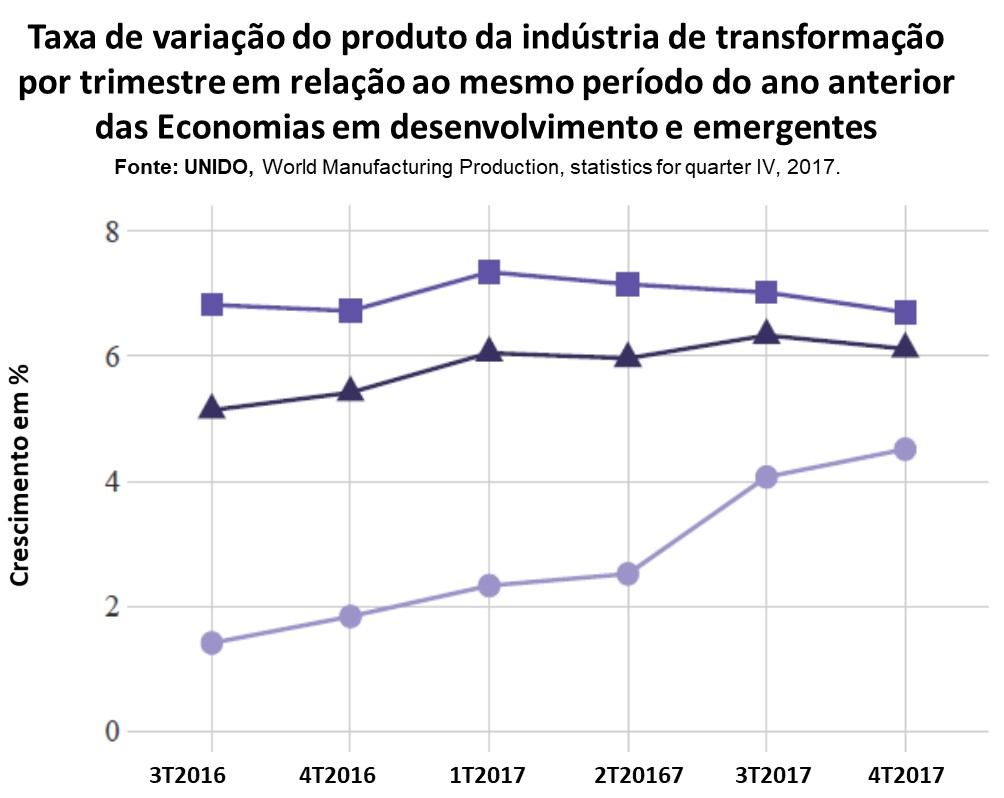 O desempenho industrial dos países em desenvolvimento. Por sua vez, a elevação de 6,1% da produção da indústria de transformação das economias industriais emergentes e em desenvolvimento em outubro-dezembro 2017 comparativamente ao mesmo trimestre de 2016 também foi generalizado entre as regiões: África e América Latina, com 2,9%, Ásia e Pacífico, com 6,5%, e Outros, com 8,4% (principalmente países do Leste Europeu).