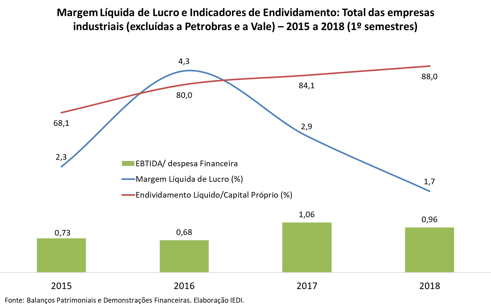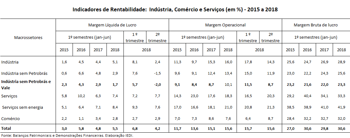 • A margem líquida de lucro da indústria (exceto Petrobras e Vale) recuou de 2,9% no primeiro semestre de 2017 para 1,7% em igual período de 2018. Na origem desta involução está o prejuízo (margem líquida negativa) de 2% registrado em abril-junho/2018.