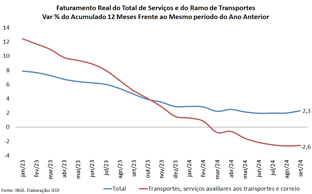 Os transportes, seus auxiliares e correios, por sua vez, amenizaram a trajetória de contração de faturamento ao longo do primeiro semestre e mantiveram o patamar de queda no 3º trim/24: -1,8% ante -1,5% no 2º trim/24. Os transportes de carga (-7,6% no 3º trim/24) e aéreo (-1,9%) são os componentes que condicionam o sinal negativo deste ramo como um todo, sendo parcialmente mitigados pelo transporte rodoviário de passageiros (+5,1%)