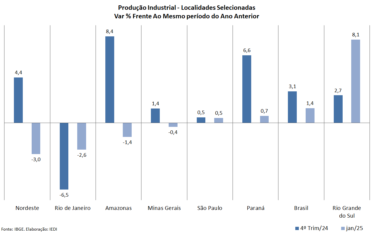 Um dos maiores freios ao desempenho industrial de jan/25 foi o ramo extrativo, cuja produção para o total Brasil caiu -2,4% ante dez/24. Por isso, não é de se estranhar que os parques industriais onde esta atividade pesa mais também tenham ficado no vermelho. Foram os casos do Pará (-3,9%) e do Espírito Santo (-2,6%), por exemplo. Minas Gerais escapou à regra, mas cresceu pouco (+0,8%).
