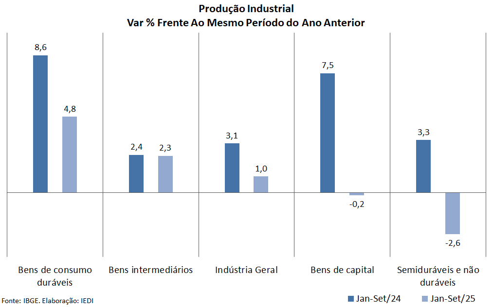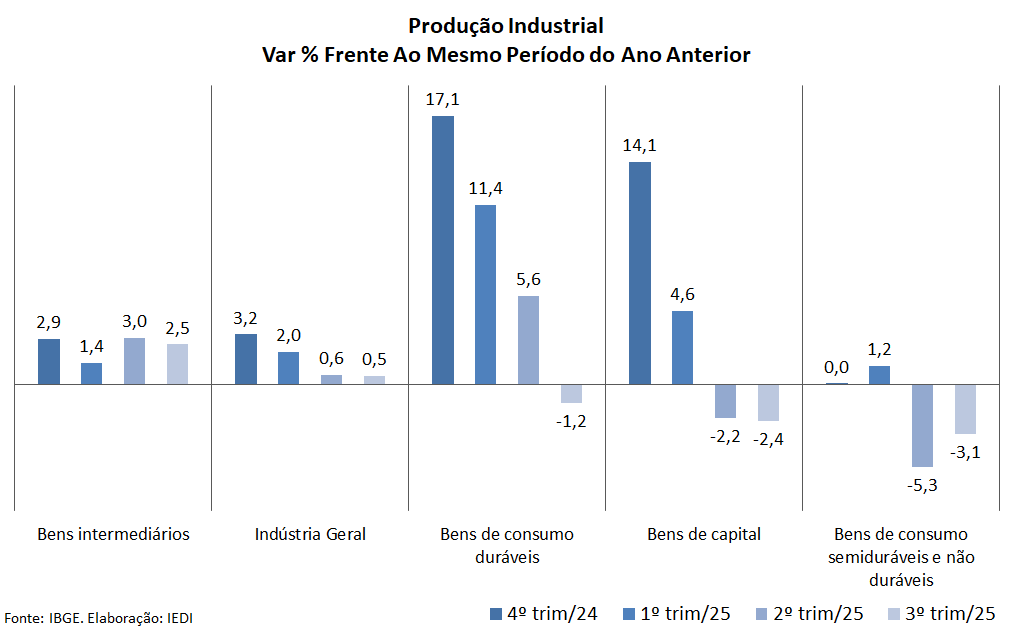 À exceção de bens intermediários, cuja produção segue resiliente, estimulada sobretudo por ramos vinculados à atividade agrícola, como defensivos agrícolas (+21,1% no 3º trim/25 ante o 3º trim/24), intermediários têxteis (+13,1%), celulose (+8,9%) e intermediários alimentícios (+4,3%), todos os demais macrossetores passaram a perder produção.