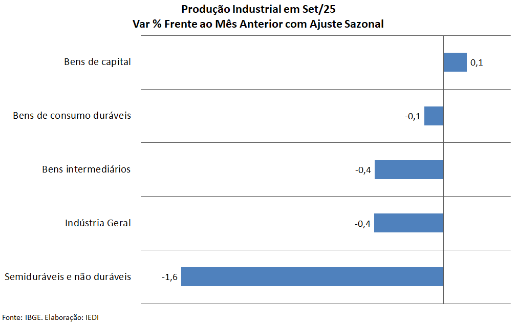 Já descontados os efeitos sazonais, a produção da indústria geral recuou -0,4% na passagem de ago/25 a set/25, sendo que 3 dos seus 4 macrossetores ficaram igualmente no vermelho. A única exceção foi o de bens de capital, após dois meses seguidos de declínio, mas que ainda assim conseguiu apenas se manter virtualmente estável (+0,1%).