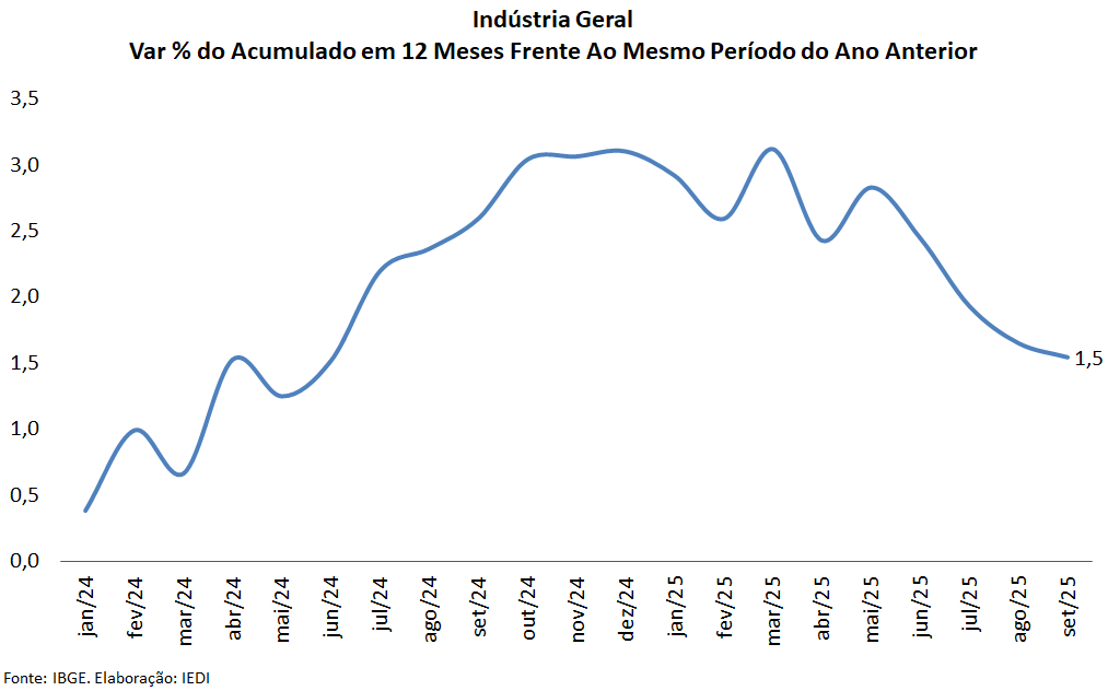 Dos nove meses já cobertos pelas estatísticas do IBGE, a indústria não cresceu em cinco deles e nos demais meses, em geral, ficou perto da estabilidade. As exceções, ainda na série com ajuste sazonal, foram mar/25 (+1,8%) e ago/25 (+0,7%), insuficientes para evitar o enfraquecimento dos resultados em comparação com a situação industrial de um ano atrás.