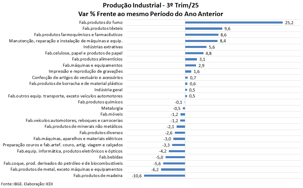 Como mostram as variações interanuais a seguir, depois de passar a maior parte de 2024 com resultados trimestrais acima de +3%, o dinamismo industrial do 3º trim/25 foi de apenas +0,5% para a indústria como um todo e voltou à região negativa quando excluídas as atividades extrativas: -0,4% no 3º trim/25 e -0,6% no 2º trim/25 para a indústria de transformação.
