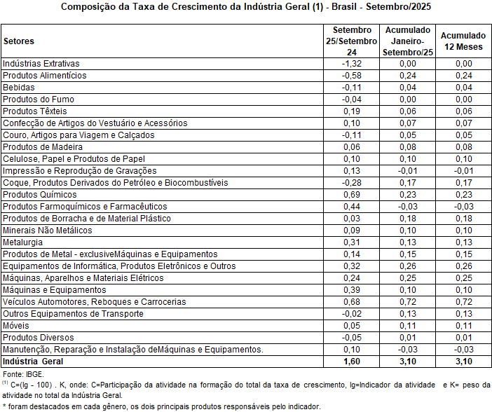 • Indústria geral: +3,2% no 4º trim/24; +2,0% no 1º trim/25; +0,6% no 2º trim/25 e +0,5% no 3º trim/25;
