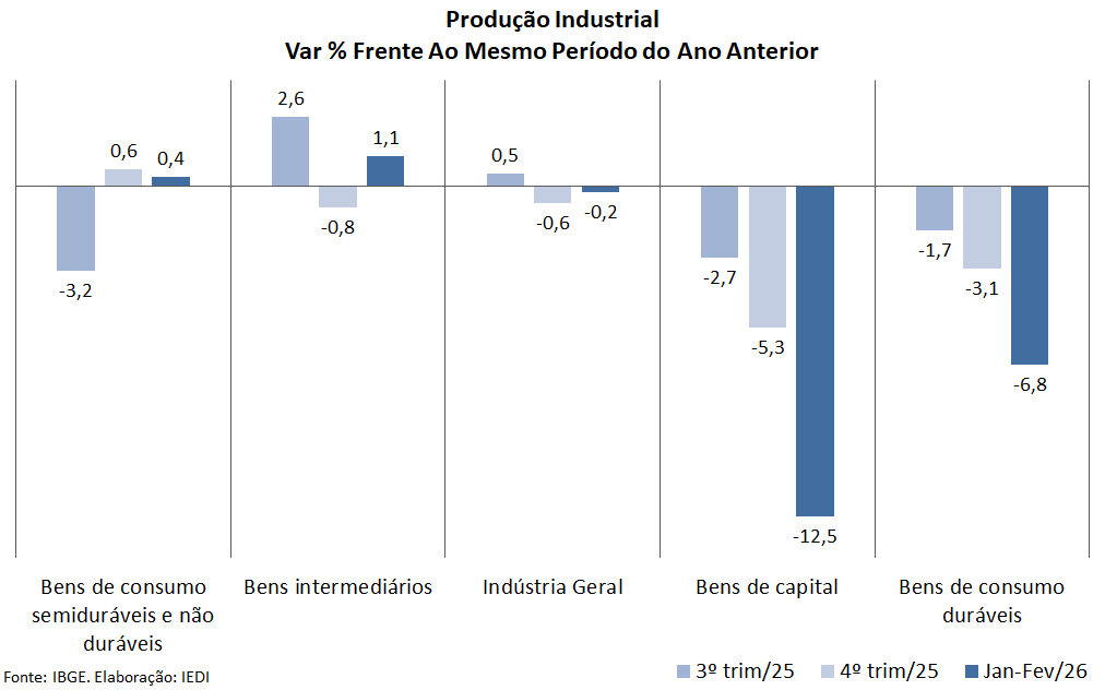 Este foi o caso de têxteis, com -11,8% em jan-fev/26, isto é, um recuo duas vezes mais intenso que no final de 2025 (-5,9% no 4º trim/25). Foram também os casos de calçados (-11,1% ante jan-fev/25) e vestuários (-11,2%). Dado o perfil destes bens, esta evolução reflete a desaceleração do consumo das famílias, premido pelos elevados índices de endividamento em uma conjuntura de taxas altas de juros.