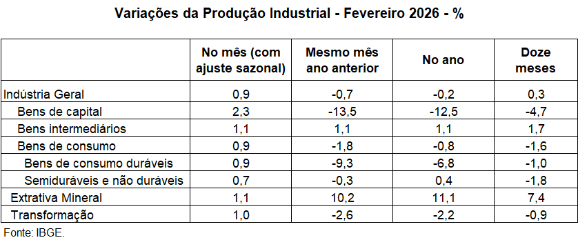 A produção industrial, que havia registrado +2,1% em jan/26, já descontados os efeitos sazonais, variou +0,9% em fev/26. Embora a base de comparação seja baixa, depois da sequência de resultados desfavoráveis em 2025, vale notar que fazia tempo que não havia duas altas consecutivas nesta comparação mais de curto prazo.