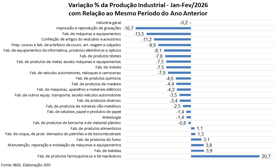 Já a produção de bens de consumo semi e não duráveis evitou o sinal negativo, mas não se distanciou muito da mera estabilidade. Registrou +0,4% em jan-fev/26 ante jan-fev/25. Apesar disso, não deixou de contar com segmentos em grande declínio.