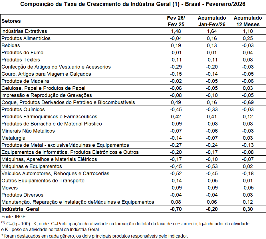 • Indústria geral: +0,5 no 3º trim/25; -0,6 no 4º trim/25; -0,2% em jan-fev/26