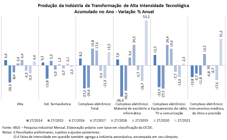 A indústria de alta intensidade registrou alta de +4,4% no 1º sem/21, em boa medida devido ao 2º trim/21, quando avançou +8,0%. Apesar disso, não conseguiu repor as perdas provocadas pela pandemia, que já haviam se sobreposto às de 2019: -6,3% no 1º sem/21 e -9,5% no 1º sem/20. O principal fator desta reação coube ao complexo eletrônico, com crescimento de +15,5% na primeira metade do ano e +31,5% no 2º trim/21.