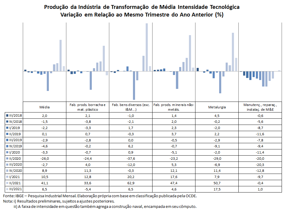 Dos quatro segmentos da indústria geral por intensidade tecnológica, somente o de média intensidade logrou expansão nas quatro bases de comparação expostas. A faixa de média-alta intensidade registrou queda na comparação entre meses de setembro, mas, ainda assim, cresceu nas demais bases comparativas. As faixas de alta intensidade e de média-baixa intensidade produziram menos quer em setembro, quer no terceiro trimestre em relação aos mesmos períodos de 2020. E as quatro faixas de intensidade registraram crescimento no segundo trimestre maior do que em junho, evidenciando os pesos de abril e maio na comparação com seus equivalentes do ano passado. Porém, apesar dessas taxas, ainda apresentaram incremento no acumulado do ano e em doze meses.